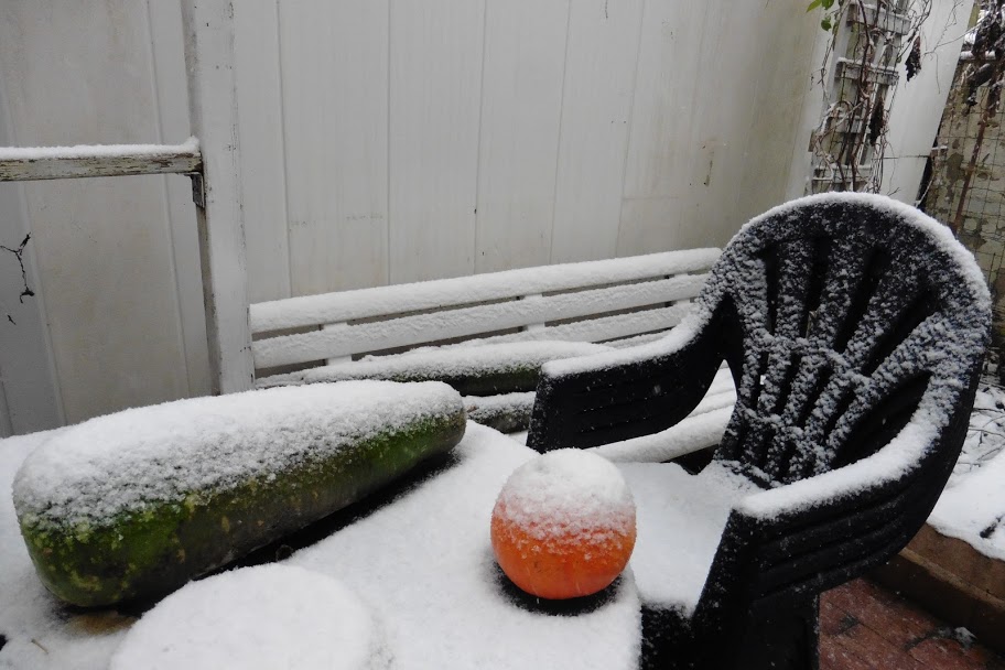 Quả bầu sao và bí đỏ bỏ quên lúc ban chiều ngoài vườn, phủ đầy tuyết.