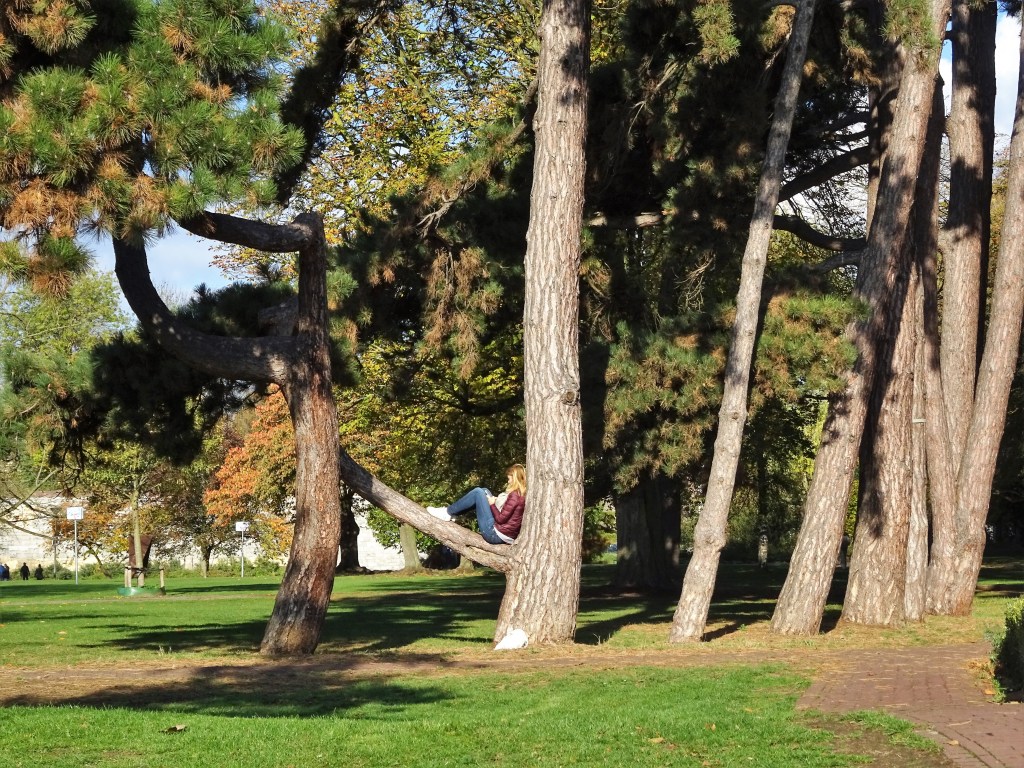 Từ trạm bus nơi cầu Maastricht, đi thêm khoảng 200m là vào công viên, ngay đầu công viên có cây thông có dáng đặc biệt, chỗ nhánh ngang này hay bắt gặp các cô sinh viên của đại học Maastrich gần đấy, ngồi học bài.Hình zoom từ xa