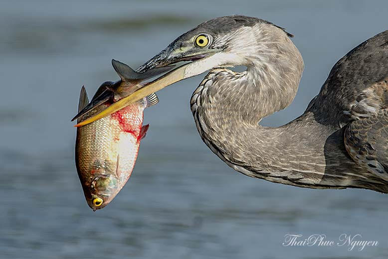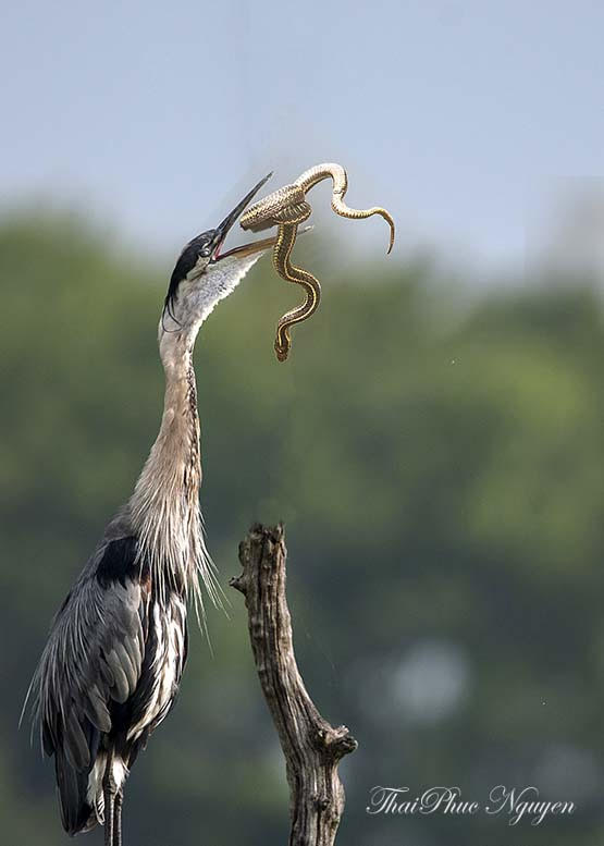 Sau đó chim khéo léo tung hất thế nào để đầu con mồi chúc xuống mà chui vào cổ họng chim. Gặp trường hợp mồi quá lớn chúng sẽ nhả ra nhưng đôi khi do tham lam GBH sẽ mắc nghẹn và chết cùng con mồi.