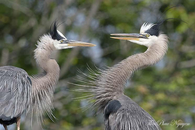 Chim luôn thực hiện những màn tán tỉnh công phu khi gặp được bạn tình ưng ý như vươn cao cổ và giữ mỏ gần như thẳng lên trời đồng thời dựng các chùm lông lên để cho bạn tình thấy sự hấp dẫn, sự mạnh mẽ của mình trong tình yêu như thế nào.