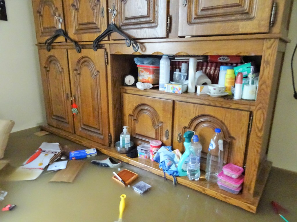 Sau bữa trưa ngày 16/7, mấy đứa con xuống đón hai vợ chồng lên Bruxelles lánh nạn, tầng trệt nước đã rút hết nhưng tầng hầm nước vẫn còn cách trần gần 50cm. Hàng xóm bắt đầu dọn dẹp nhà cửa, cứu hộ đến giúp những nhà ngập nặng bơm nước ra, chúng tôi ghé nhà đứa con lớn trú ngụ để hôm sau cùng hai cậu con rể , đứa con gái út và bạn của chúng nó đến phụ dọn dẹp.