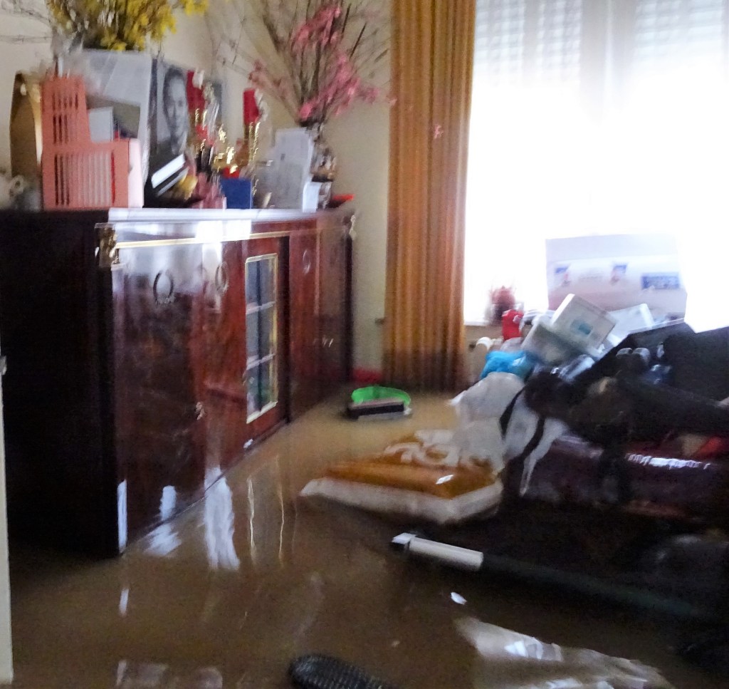 An tâm ngủ một chút, thức dậy còn nhiều việc phải làm. Lúc 8 giờ sáng thì nước đã rút khỏi phòng khách và ở ngoài cũng rút thêm đến nửa lề đường. Dưới cave( tầng hầm) nước vãn còn dụng trần.