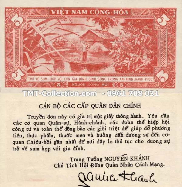 Hình tờ giấy 5 đồng VNCH dùng làm truyền đơn kêu gọi cán binh cộng sản hồi chánh, mặt sau có in bài thơ của cán binh cộng sản