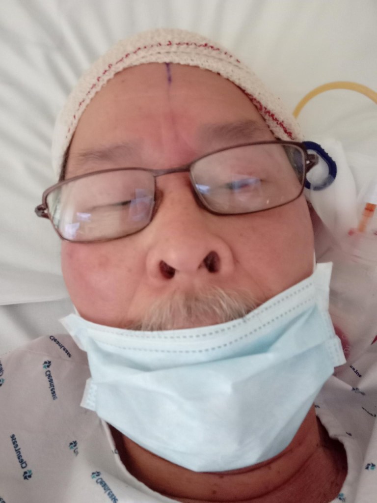 một bv lớn, mới xây dựng chỉ cách nhà chưa đến 1km. Như vậy 5 tuần sau, xuất hiện triệu chúng đến tuần thứ 8 thì vào cấp cứu.. Nơi phòng cấp cứu sau những thủ tục thông thường như đo áp huyết, lấy máu thử và truyền dịch, tôi được đưa đi làm scan cái đầu và không lâu sau đó nhận được kết quả là máu tụ nơi đầu bên phải, chỗ trên thái dương, và nhà thương quyết định phải giải phẫu vào sáng sớm ngày hôm sau, lúc đó cũng gần 23 giờ ngày thứ sáu. Tôi được đưa vào phòng săn sóc đặc biệt và 8 giờ sáng hôm sau 8/1/2022 cuộc phẫu thuật bắt đầu, chỉ biết là lúc tỉnh nhìn đồng hồ, lúc đó là 10 giờ sáng. Phẫu thuật xong, trở về phòng săn sóc đặc biệt, để nơi đây kiểm soát và theo dõi. Kể từ lúc này không được vận động mạnh, phải nằm im một chỗ, mọi việc có y tá chăm sóc. Bác sĩ giải phẫu có nói rằng « nếu tôi không vào bv tối hôm thứ sáu thì có thể nguy hiểm tính mạng vào lúc ngủ ». Đầu băng bó chỉ thấy một ống cao su gắn vào chỗ mổ và thông vào một bình plastic có dung tích 150 Cc, bình này nhìn hình thù như quả lựu đạn được treo bên thái dương và máu trong chỗ mổ được rỉ ra. Ngày hôm sau, chủ nhật 9/1/2022, cũng có đến 2 bình chứa máu tràn ra và tôi được đưa đi làm scan lần thứ hai. Mọi việc êm đẹp, nhưng vẫn phải nằm im một chỗ cho đến ngày thứ hai, khi bs kiểm soát lại mới cho phép quăng bỏ trái « lựu đạn máu » ra khỏi trán, lúc đó tôi mới được phép ngồi dậy tự bước ra khỏi giường. Y tá, bác sĩ thăm viếng liên tục còn cả Kiné đến xoa bóp, vận động. Sáng nay, thứ ba 11/1/2022 sau khi bác sĩ giải phẫu kiểm soát lần cuối và Ara được phép xuất viện với cái hẹn ngày 4/2/2022 tái khám làm scan lần thứ ba.