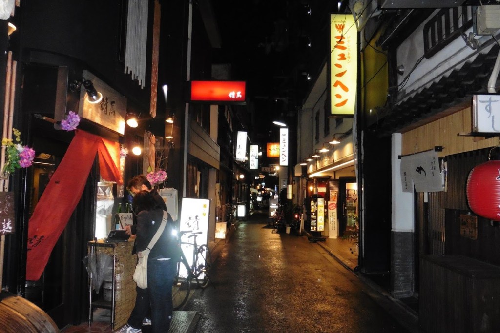 Có thượng vàng ắt phải có hạ cám…tiếc rằng khi hắn thả bộ vào khu « hạ cám » do sư phụ « Google map » hướng dẫn … nơi một con đường nhỏ bề ngang khoảng 3m, hai bên đường là những quán Saké ôm, những phụ nữ phục vụ hằn lên nét mệt mỏi, tiếp saké cho những khách làng chơi…bảo kê dòm ngó du khách, làm hắn cũng ngại không đưa vào tầm ngắm được tấm ảnh nào để lưu niệm. Kyoto là thủ phủ của ngành » vạc ăn đêm » này .