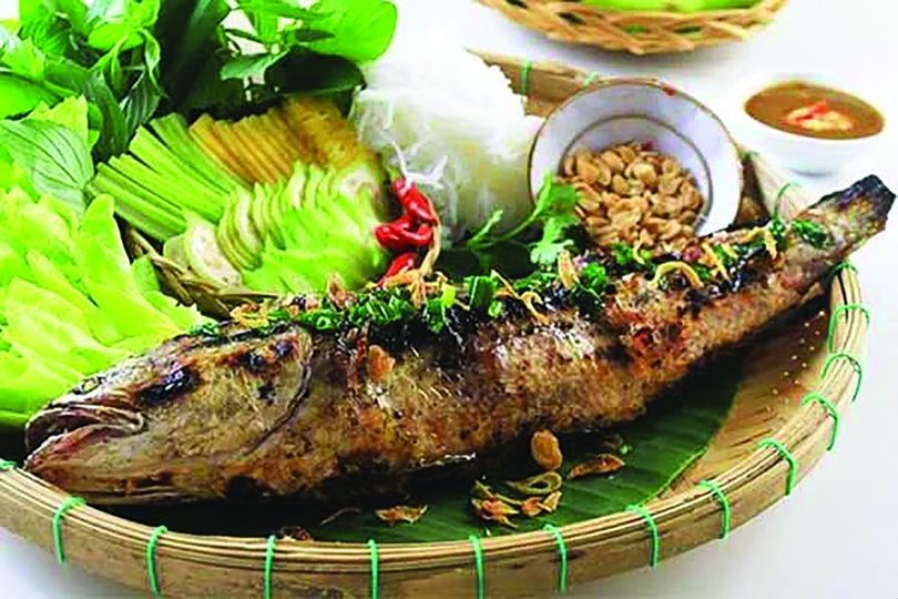 Cũng mảnh bánh tráng, lót thêm miếng rau diếp và những mùi rau thơm khác, xắn một miếng cá, quấn lại, chấm vào mắm, rồi nhẩn nha ăn, kèm thêm chung rượu đưa cay.