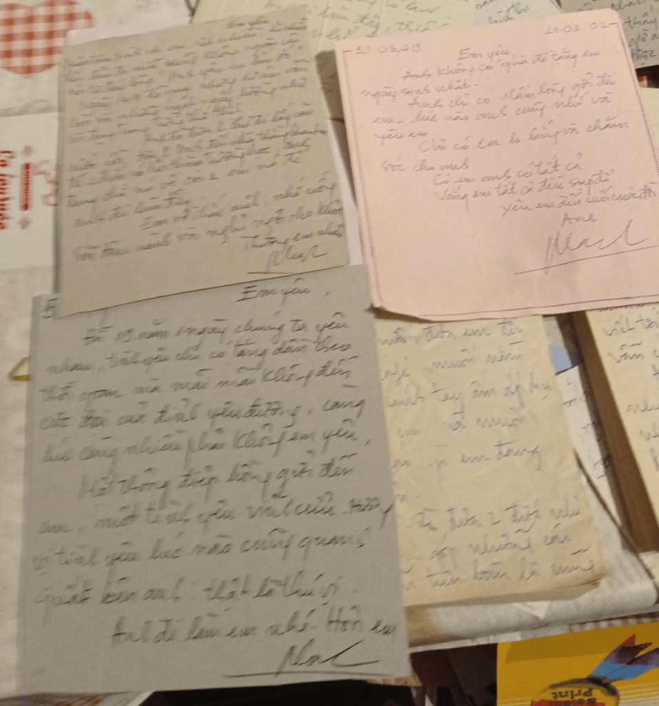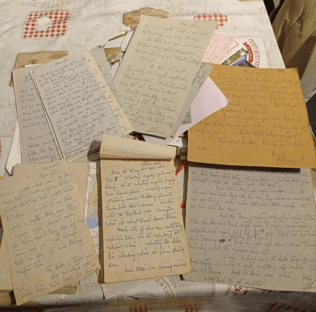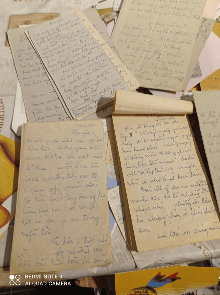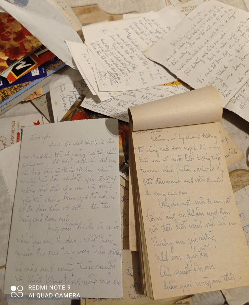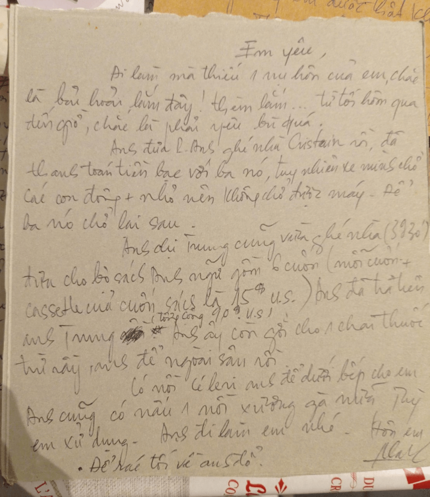 Cũng chẳng phải là những lá thư tình màu xanh màu hồng lâm li như thể nào, chỉ biết trong bất cứ một mảnh giấy nào có trong tay, một trang vở học sinh, đủ mọi khổ lớn nhỏ, cứ mở đầu là hai chữ « em yêu » và chấm dứt với hai chữ « yêu em » hay « hôn em ».