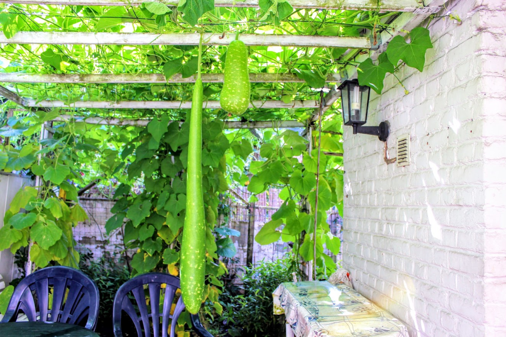 Cũng có chút kinh nghiệm cuốc cày hắn đã biến mảnh đất của hắn thành một khu vườn cho vợ hắn có thú vui, giàn gỗ được thả những dây bầu, bí, su để quả bám cho vui mắt.