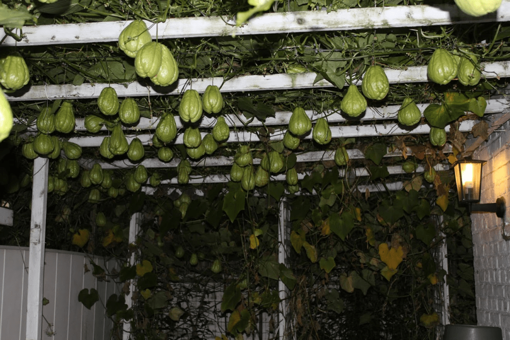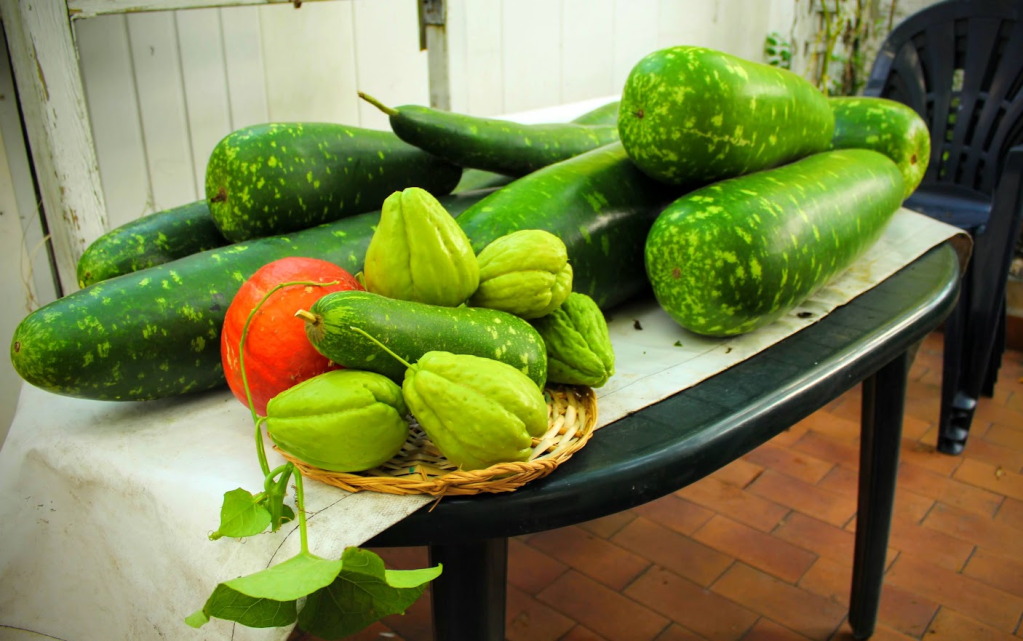 Cũng có khi hắn cho bầu leo chung giàn với su, họ nhà bầu chỉ « ăn hiếp » được bí khi chung giàn(bầu ơi thương lấy bí cùng), nhưng chung với su, không ăn hiếp nổi mà có phần lép vế, không được nhiều quả bằng su. Quả su hắn trồng cứ 3 trái được khoảng 1kg mà năm nào cũng không dưới 500 quả, bò leo khắp nơi, lên mái nhà, leo quấn vào cửa sổ, bò qua nhà hàng xóm, đem cho nhiều người lấy thảo, « cồng » của hắn chế biến đủ thứ, canh, xào, đồ chua, bò bía, gỏi hay nấu soupe, cái thứ su « bio » này ngọt lắm, làm đủ kiểu có khi còn cắt đông lạnh để mùa đông tuyêt phủ đem nấu canh với tôm khô, vậy mà cũng còn cả trăm quả nảy mầm để gieo trồng vào mùa sau.