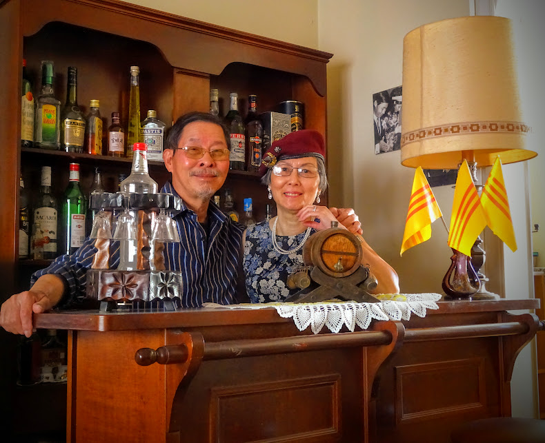 Quầy rượu vợ hắn tặng hắn vào dịp sinh nhật, cũng đã 30 năm, thỉnh thoảng hai vợ chồng ngồi ở comptoir nhâm nhi chút men, nay chỉ là dĩ vãng, trận lụt nước ngập đến bụng, bao nhiêu ly tách và rượu để phía dưới phải bỏ, cũng chụp hình đưa lên mạng cho ai muốn lấy, chỉ ngày hôm sau là có người đến chở đi, có cả hai chiếc tabouret trước quầy. Những lá cờ VNCH mỗi lần hai vợ chồng tham dự một sự kiện của cộng đồng, để tưởng nhớ những ngày đã qua.(photo Ara)