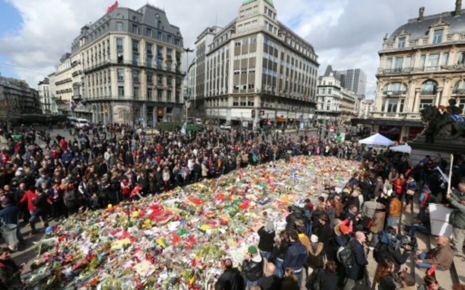 Những người Bỉ đặt hoa tưởng niệm nạn nhân vụ khủng bố; mọi người nắm tay nhau đồng lòng chiến đấu với khẩu hiệu « je suis Bruxelles »