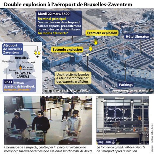 Khoảng 7h45 sáng 22/3, một chiếc taxi đã thả ba người đàn ông và vali của họ xuống sân bay Brussels, nằm ở phía đông bắc thủ đô Bỉ. Ba kẻ khủng bố đã đi từ vùng ngoại ô Molenbeek của Bruxelles. Ngay trước 8 giờ sáng, một trong những kẻ khủng bố đã cho nổ quả bom đầu tiên đựng trong vali của hắn, tại quầy làm thủ tục hành lý gần quầy số 11. Vài giây sau, vụ nổ thứ hai vang lên ở quầy số 2, kẻ khủng bố thứ hai đã cho nổ quả bom. giấu trong hành lý của mình. Sân bay sau đó đã được sơ tán. Vì một lý do nào đó không rõ, tên khủng bố thứ ba không nổ bom và bỏ trốn. Nơi hiện trường, lực lượng an ninh Bỉ phát hiện một chiếc túi chứa thiết bị nổ thứ ba này, mạnh hơn hai quả trước. Thiết bị này bị phá hủy khi lực lượng rà phá bom mìn tới nơi cho nổ mà không gây thương vong cho ai . Vụ tấn công tự sát kép này đã khiến khoảng 20 người thiệt mạng và hàng chục du khách bị thương. Vụ nổ gây thiệt hại đáng kể, buộc chính quyền phải đóng cửa sân bay trong nhiều tuần.