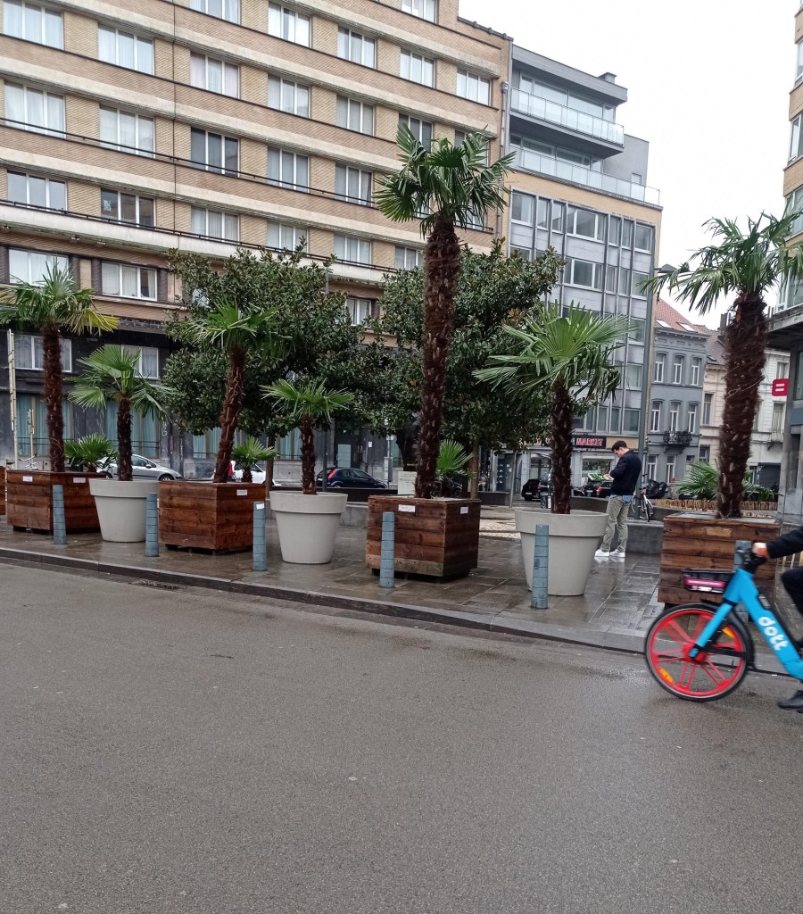 Từ khi có những cuộc tấn công tự sát của nhóm thánh chiến Hồi giáo, khi chúng lái xe tải hạng nặng nhào vào những khu vực dành cho người đi bộ ở Bỉ , Đức hay ở Pháp (Nice) . Mỗi nơi tìm một phương cách chống lại… ở Bỉ nơi những khu vực đông người đi dạo, những mũ nâu para- commandos canh gác duy trì trật tự . Những nơi họp chợ, ngay 2 đầu vào chợ hoặc là quân xa hoặc là xe vận tải lớn án ngữ và họ đưa ra một phương án nữa là đặt những chậu cây khổng lồ nặng có đến cả tấn trước những con đường dẫn đến khu đi bộ như trong tấm ảnh hắn chụp ở place Flagey, chỗ sáng sáng hắn hay ngồi uống café, vừa có không gian tươi mát và thấy mình như được bảo vệ .
